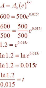 Example 4: The current enrollment in the nursing program at a local community college is 500 students. The enrollment is increasing continuously at a rate of 1.5% each year. Which logarithm is equal to the number of years it will take for the enrollment to increase to 600?