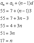When solving for n, be sure your answer is a positive integer. There is no such thing as a fractional number of terms in a sequence! Ans. 17 terms |