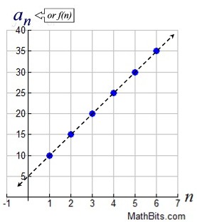 the example above, we were able to find an "explicit formula" for the sequence by examining the graph of the terms and the "line" containing the terms. Formula from the graph: an= 5n + 5. |