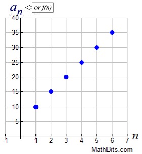 The graph, and the list of terms, can each verify that terms are increasing by a value of 5. The sequence starts at 10. This pattern of repetitive addition, allows calculation of terms based on preceding values. As a formula, we can easily state the first term to be 10, and then add 5 to each previous term.