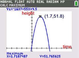 v0 = 55 and h0 = 4.5 and the formula y = -16t2 + 55t + 4.5